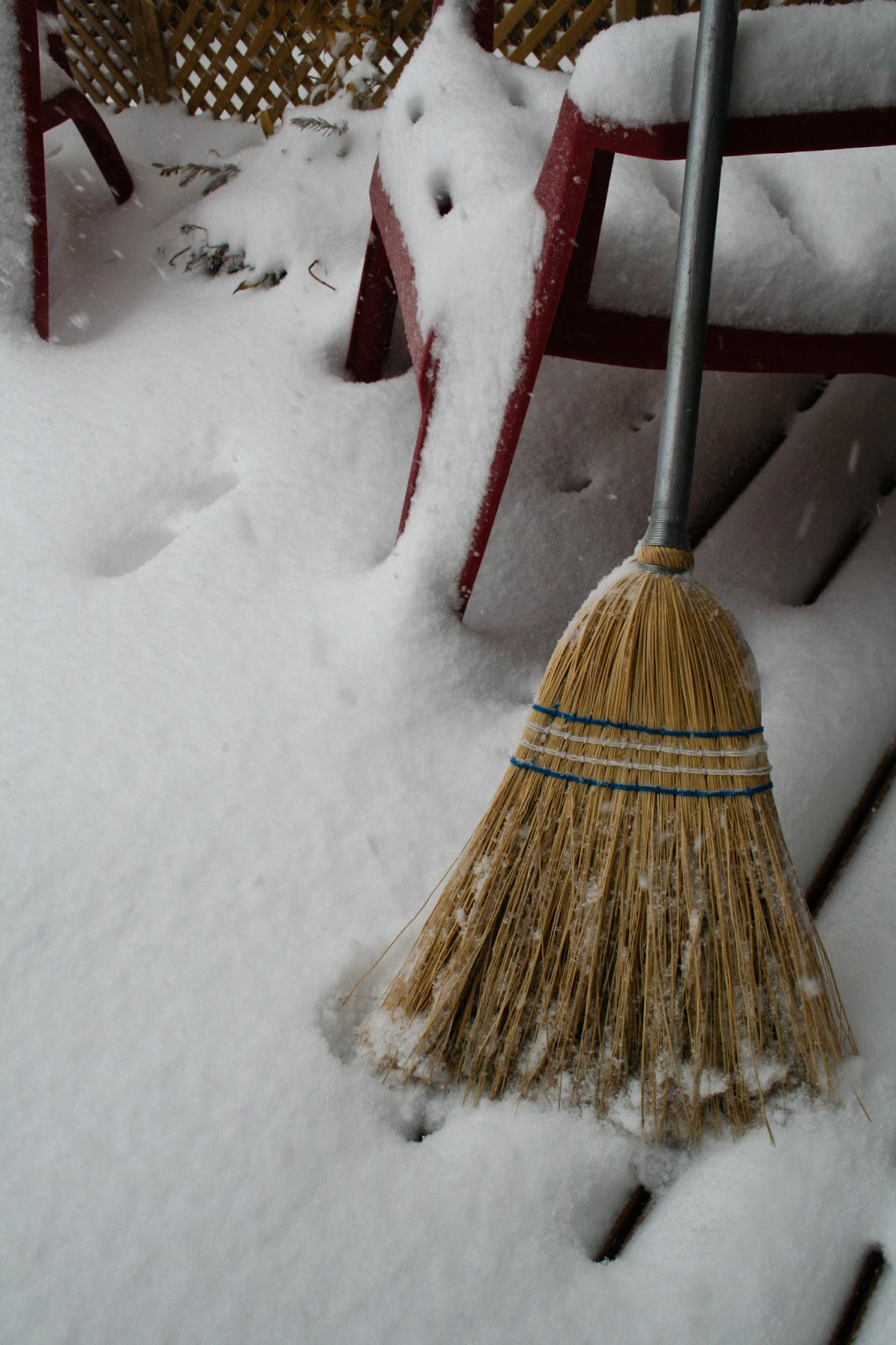 There is very little colour left in this little world now. There is the fierce beauty of the white snow covering everything and turning familiar objects into something else entirely. For instance, those plant pots, and that broom, even the garden chair has changed personality.